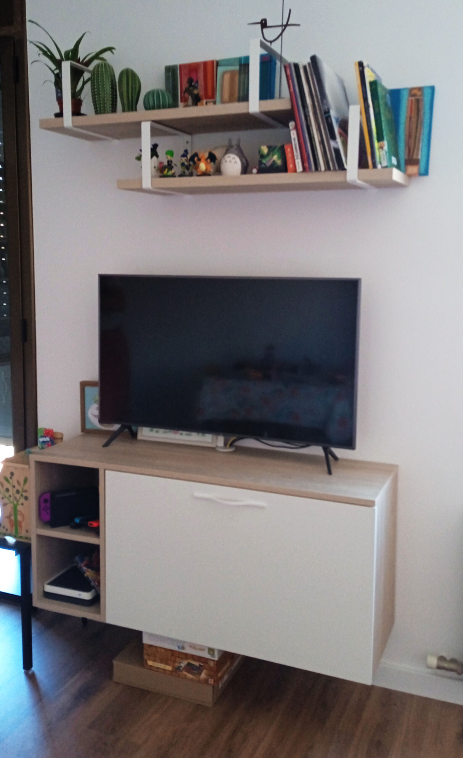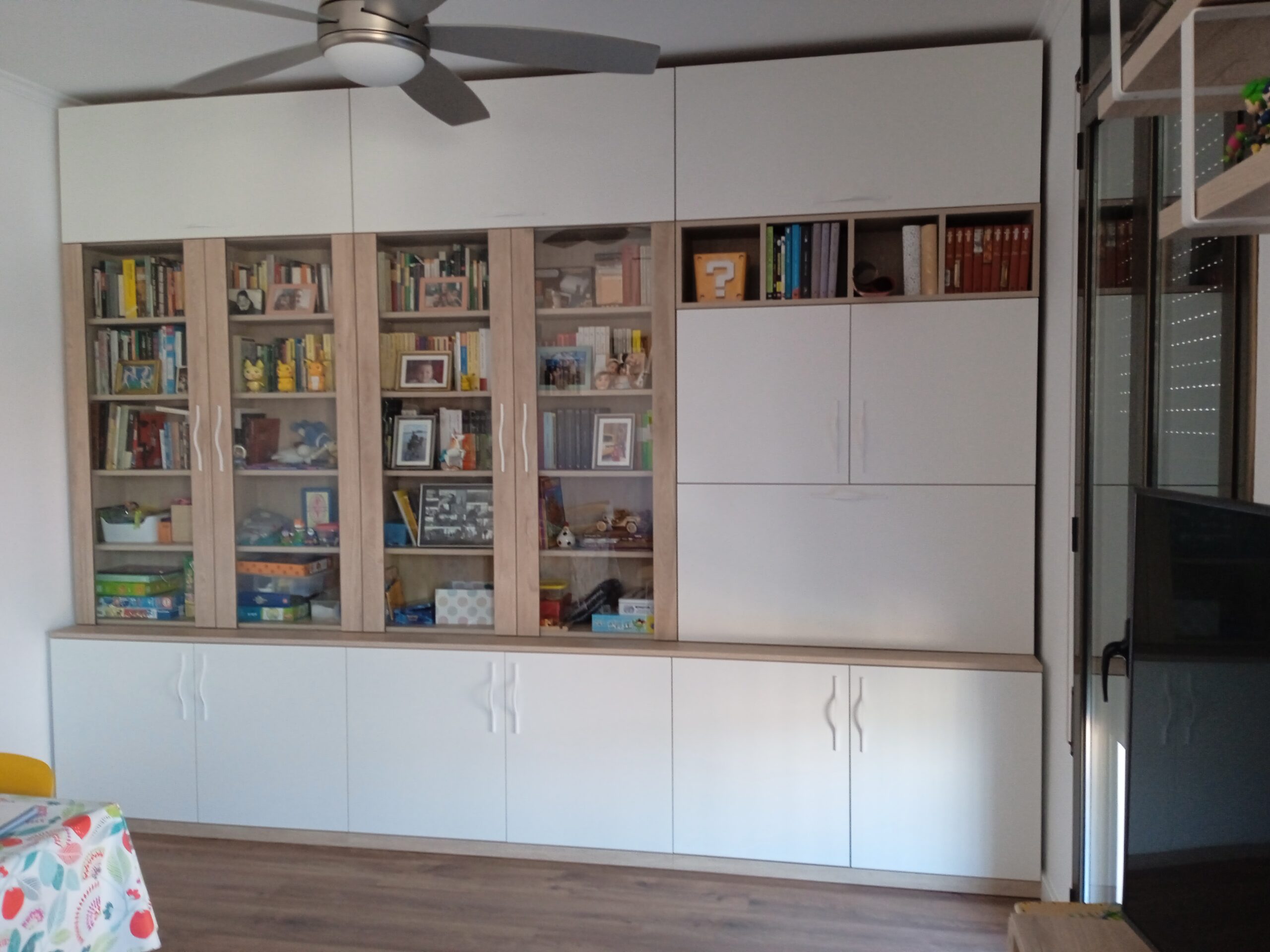 Mobiliari de menjador multifuncional, amb vitrina per a llibres, zona d’emmagatzematge i un espai de despatx que s’oculta. Si sumem la tarima, aconseguim un ambient càlid, versátil i funcional.